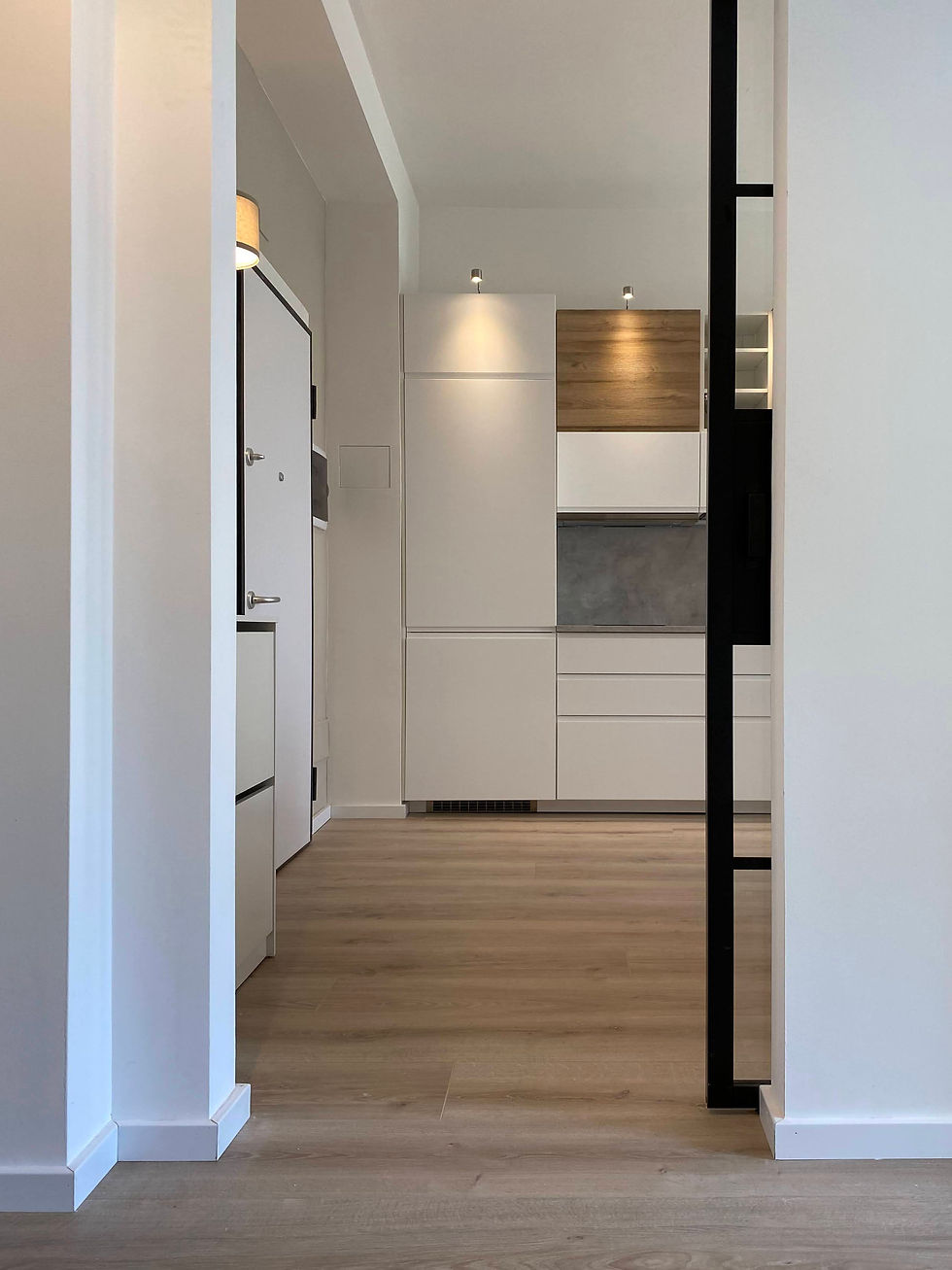 Uno dei miei preferiti. Trovare il modo di ricavare due stanze ampie e vivibili dove prima c'era solo spazio per un monolocale stretto e poco funzionale. I colori pastello rendono questo bilocale accogliente, dal gusto tipicamente scandinavo. Bagno cieco in marmo e legno.