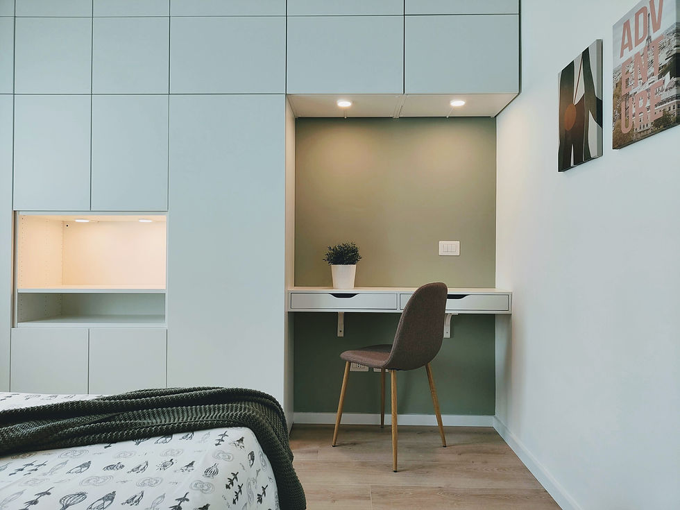 In camera da letto c'è spazio per un armadio a tutta parete e una scrivania integrata.