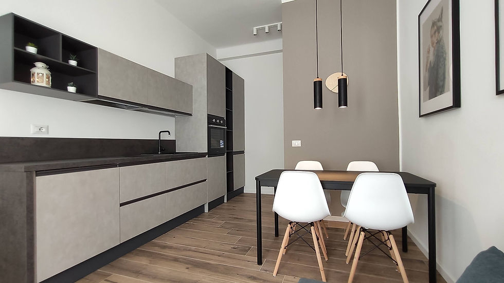 Zona giorno con cucina completa, tavolo per 4 persone, living con divano e zona TV, e zona notte con affaccio interno, nella quale è stata ricavata la camera da letto ampia. Completa la soluzione un'ampia cabina armadio nella quale è stato ricavato uno spazio per la lavatrice.